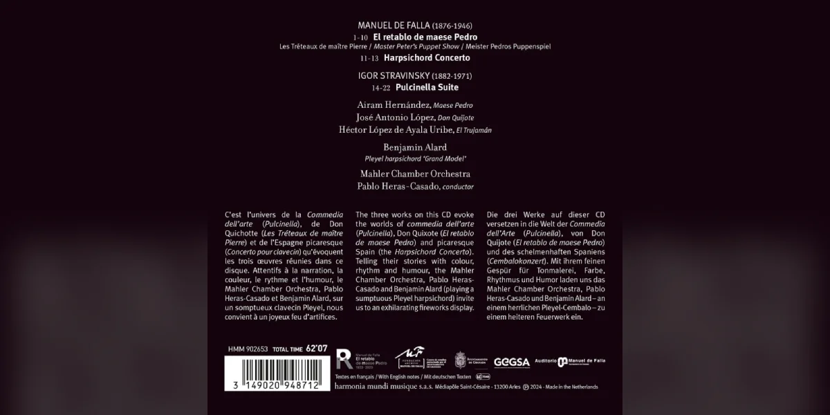 De Mahler Chamber Orchestra ass en autonomen Orchester an deem net einfach ee Manager d’Soen huet, mee d’Musekerinnen a Museker. An esou presentéiert sech dëse Kammerorchester als e Klangkierper, dee permanent op der Sich ass no neien artisteschen Aventuren. Dat gëtt och an der Programmatioun vun hirem neien Disk däitlech. Nieft der Pulcinella Suite vum Igor Stravinsky, ginn nämlech och 2 éischter onbekannte Wierker vum Manuel de Falla gespillt: de Concerto fir Cembalo an Orchester an déi kuerz Oper ‘El retablo de maese Pedro’.
